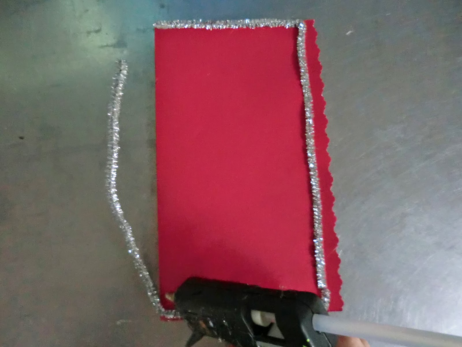 Bước 3: Gấp 1 tờ giấy có màu sắc mà bạn yêu thích và cắt đi phần thừa (kích thước do bạn lựa chọn nhé ><!). Sau đó dán dây kim tuyến bằng súng bắn keo hoặc dán dây ruy băng bằng băng keo 2 mặt xung quanh các cạnh tấm thiệp