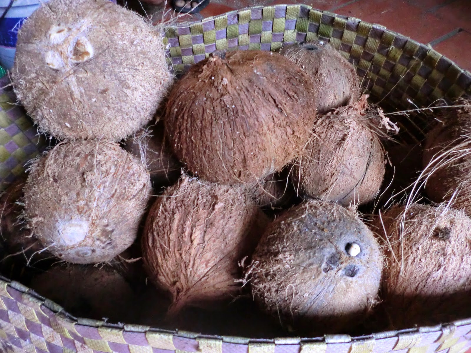 Dừa khô ở quê mình đây-Mỏ Cày Nam , Bến Tre, dừa phải thật khô thì mới có nhiều dầu, còn những trái dừa chưa khô lắm vỏ còn màu xanh, lắc nghe nhiều nước ở trong thì thắng dầu không được nhiều đó nha!