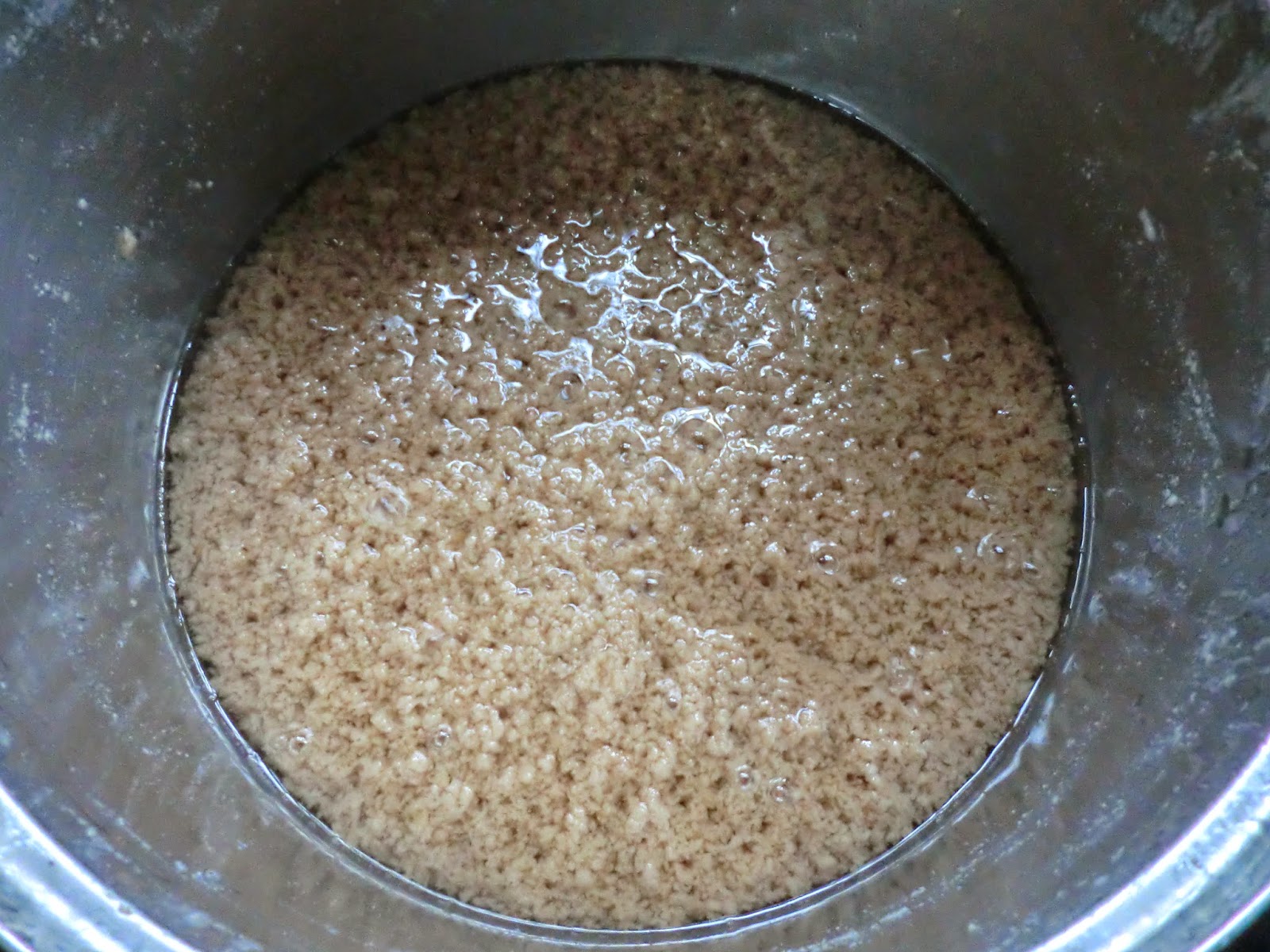 Sau hơn 2 tiếng đồng hồ thì nồi nước cốt đã chuyển sang màu nâu nhạt và có dầu nổi lên như vầy đây.